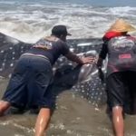 Hiu Paus Terdampar di Cengkrong Trenggalek, Dievakuasi