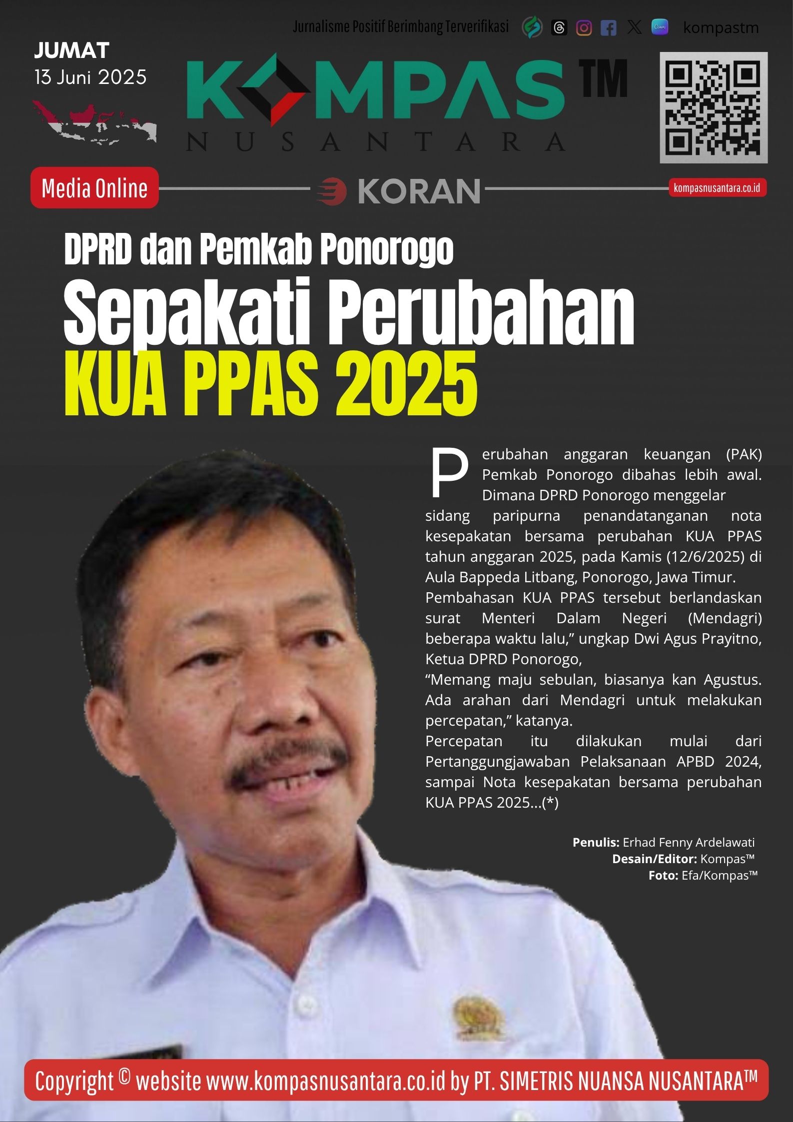 Perubahan anggaran keuangan (PAK) Pemkab Ponorogo dibahas lebih awal. Dimana DPRD Ponorogo menggelar sidang paripurna penandatanganan nota kesepakatan bersama perubahan KUA PPAS tahun anggaran 2025, pada Kamis (12/6/2025) di Aula Bappeda Litbang, Ponorogo, Jawa Timur.