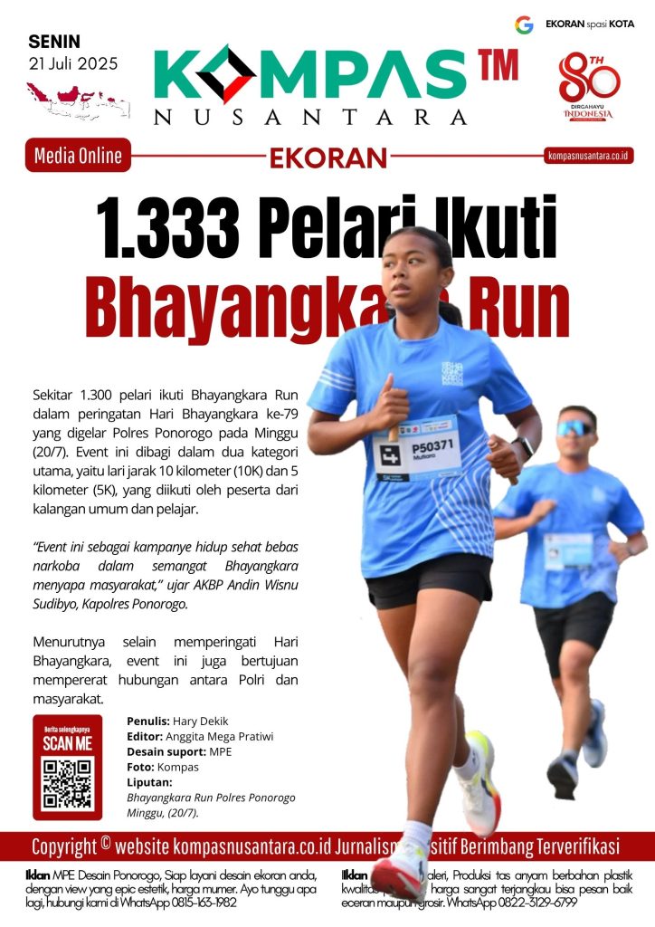 KOMPAS™, PONOROGO – Sekitar 1.300 pelari ikuti Bhayangkara Run dalam peringatan Hari Bhayangkara ke-79 yang digelar Polres Ponorogo pada Minggu (20/7).