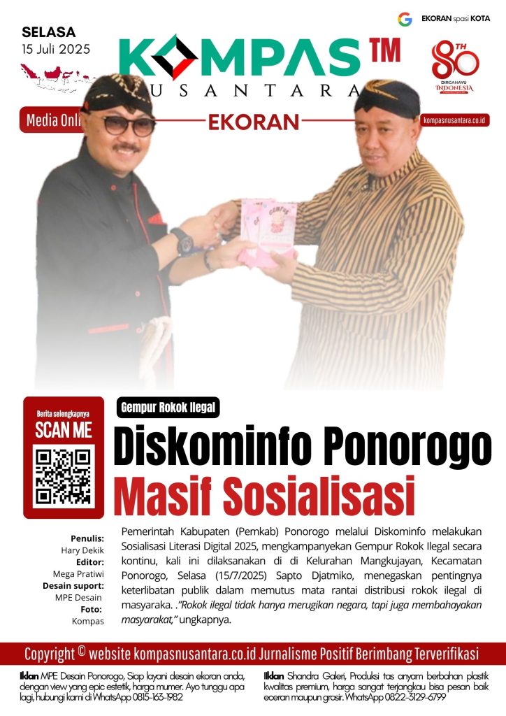 KOMPAS™, PONOROGO – Pemerintah Kabupaten (Pemkab) Ponorogo melalui Diskominfo melakukan Sosialisasi Literasi Digital 2025, mengkampanyekan Gempur Rokok Ilegal secara kontinu, kali ini dilaksanakan di di Kelurahan Mangkujayan, Kecamatan Ponorogo, Selasa (15/7/2025).