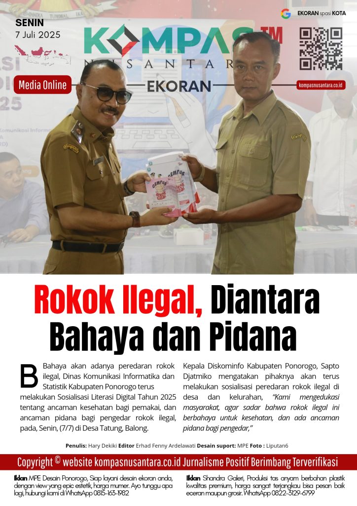 KOMPAS™, PONOROGO – Bahaya akan adanya peredaran rokok ilegal, Dinas Komunikasi Informatika dan Statistik Kabupaten Ponorogo terus melakukan Sosialisasi Literasi Digital Tahun 2025 tentang ancaman kesehatan bagi pemakai, dan ancaman pidana bagi pengedar rokok ilegal, pada, Senin, (7/7) di Desa Tatung, Balong, Ponorogo.