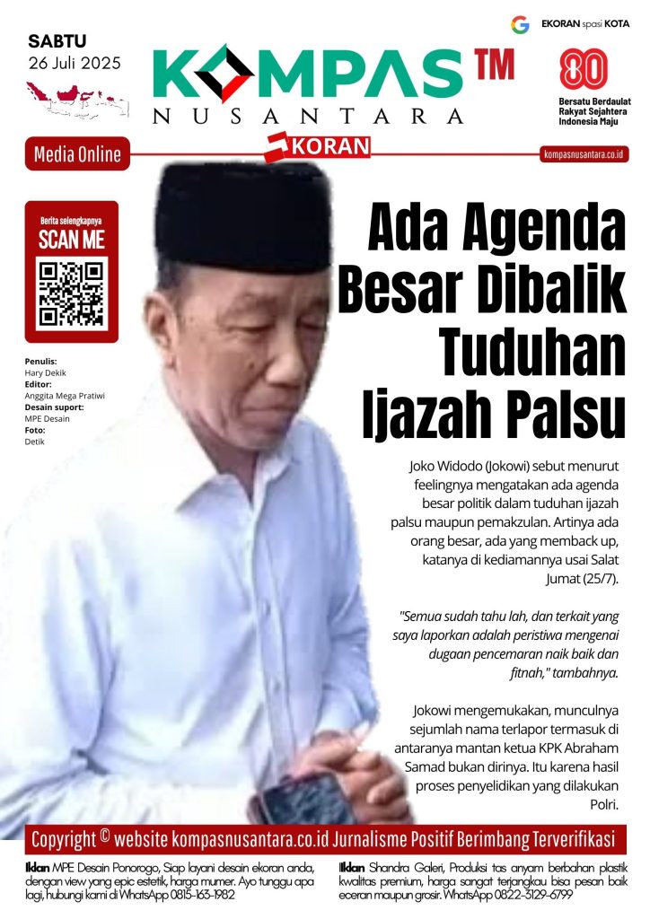 “Saya sudah sampaikan, feeling saya mengatakan ada agenda besar politik dalam tuduhan ijazah palsu maupun pemakzulan. Artinya ada orang besar, ada yang memback up,” kata Jokowi saat ditemui di kediamannya usai Salat Jumat (25/7/2025).