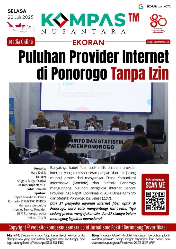 Dari 31 penyedia layanan internet fiber optik yang beroperasi di Ponorogo, baru satu mengantongi izin resmi. Tiga sedang proses mengajukan izin, dan 27 sisanya belum memegang legalitas operasional.