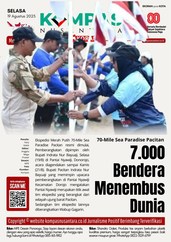 KOMPAS™, PACITAN – Ekspedisi Merah Putih 70-Mile Sea Paradise Pacitan resmi dimulai, Pemberangkatan dipimpin oleh Bupati Indrata Nur Bayuaji, Selasa (19/8) di Pantai Nyawiji, Donorojo, acara diagendakan sampai Kamis (21/8).