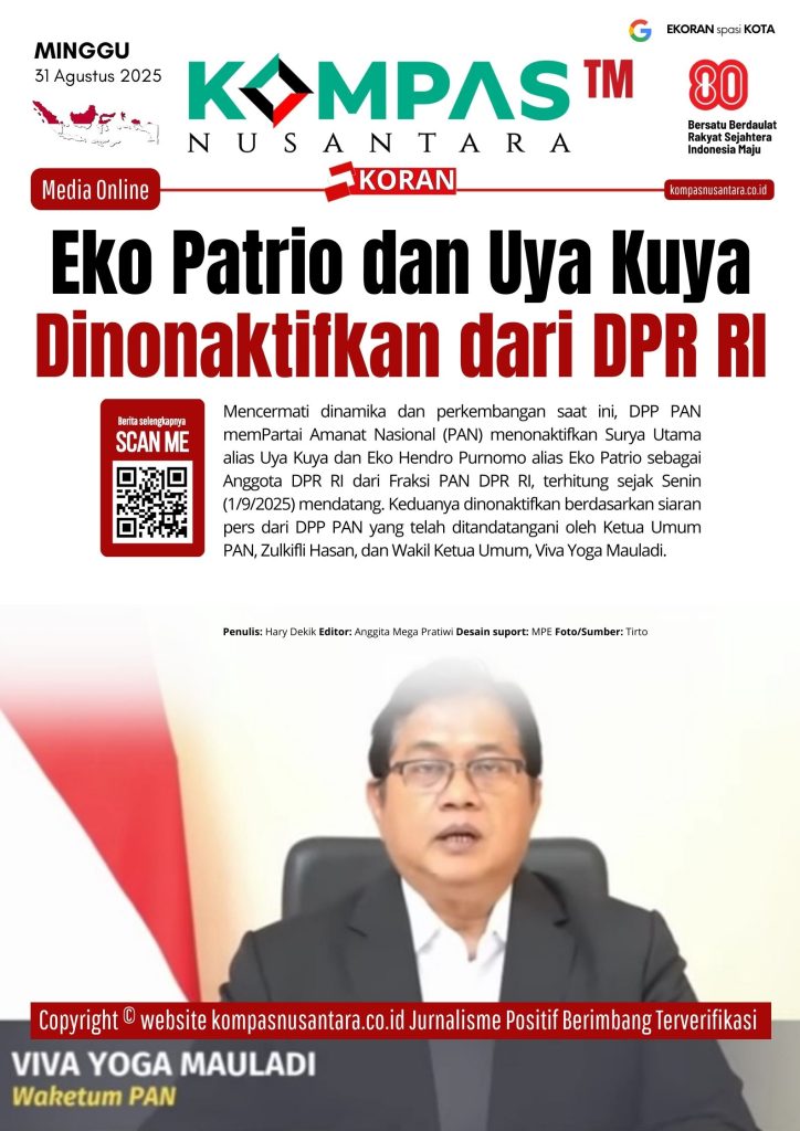 KOMPAS™, INDONESIA – Mencermati dinamika dan perkembangan saat ini, DPP PAN memPartai Amanat Nasional (PAN) menonaktifkan Surya Utama alias Uya Kuya dan Eko Hendro Purnomo alias Eko Patrio sebagai Anggota DPR RI dari Fraksi PAN DPR RI, terhitung sejak Senin (1/9/2025) mendatang.