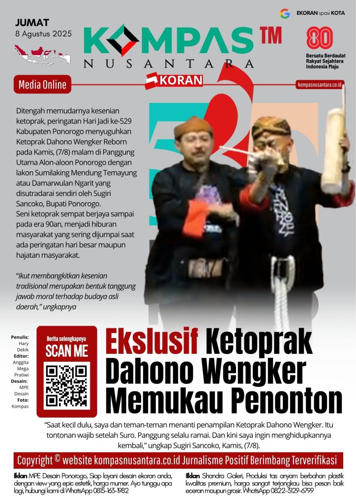 KOMPAS™, PONOROGO – Ditengah memudarnya kesenian ketoprak, peringatan Hari Jadi ke-529 Kabupaten Ponorogo menyuguhkan Ketoprak Dahono Wengker Reborn pada Kamis, (7/8) malam di Panggung Utama Alon-aloon Ponorogo dengan lakon Sumilaking Mendung Temayung atau Damarwulan Ngarit yang disutradarai sendiri oleh Sugiri Sancoko, Bupati Ponorogo.