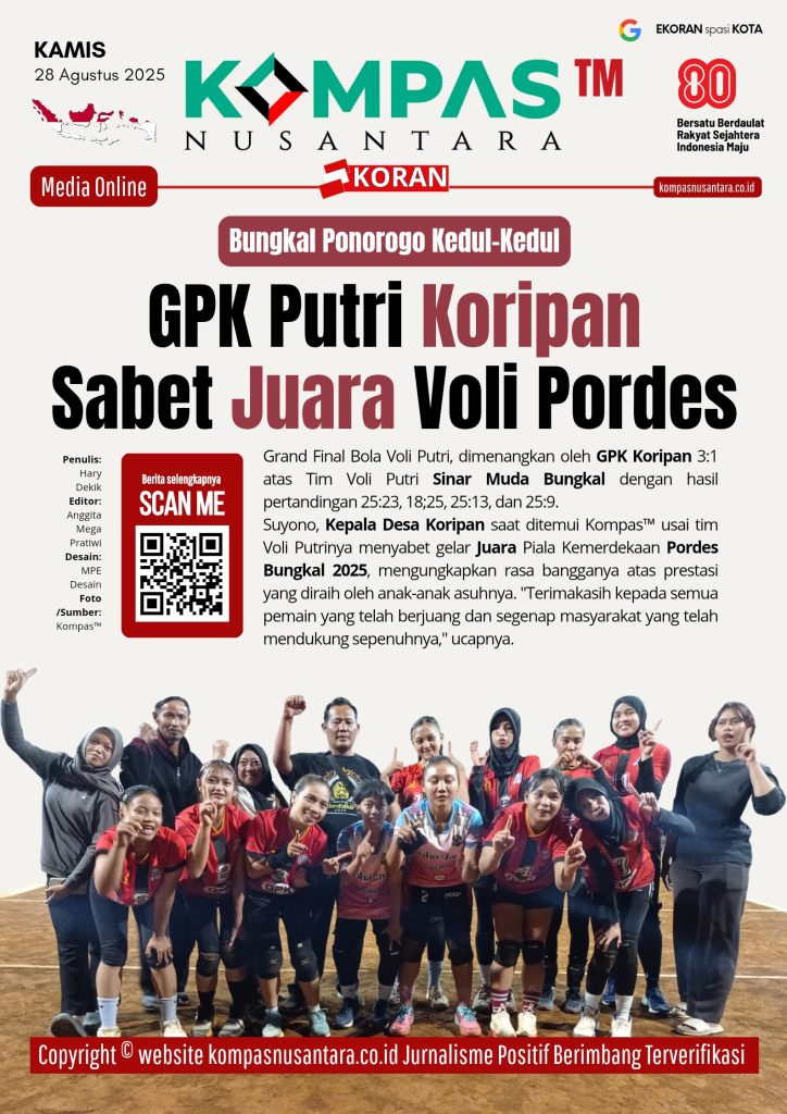 “Terimakasih kepada segenap masyarakat Desa Koripan atas semua dukungannya, sehingga Tim Voli Putri GPK Koripan meraih Gelar Juara di Pordes Bungkal Ponorogo tahun 2025,” pungkas Suyono, Kades Koripan. (*)