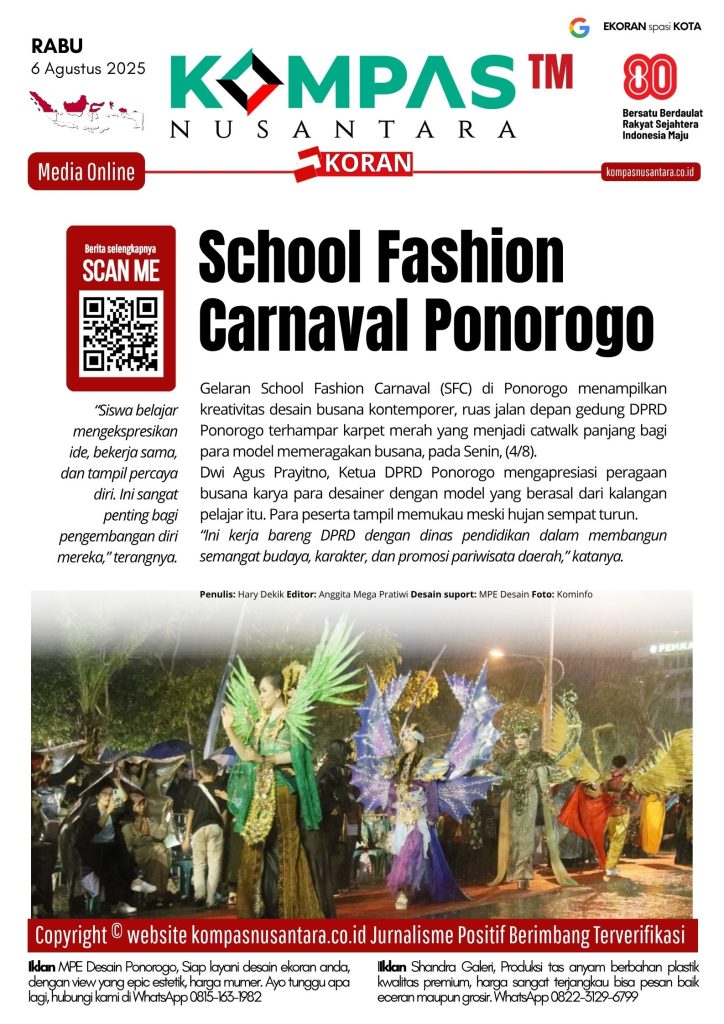 KOMPAS™, PONOROGO – Gelaran School Fashion Carnaval (SFC) di Ponorogo menampilkan kreativitas desain busana kontemporer, ruas jalan depan gedung DPRD Ponorogo terhampar karpet merah yang menjadi catwalk panjang bagi para model memeragakan busana, pada Senin, (4/8).