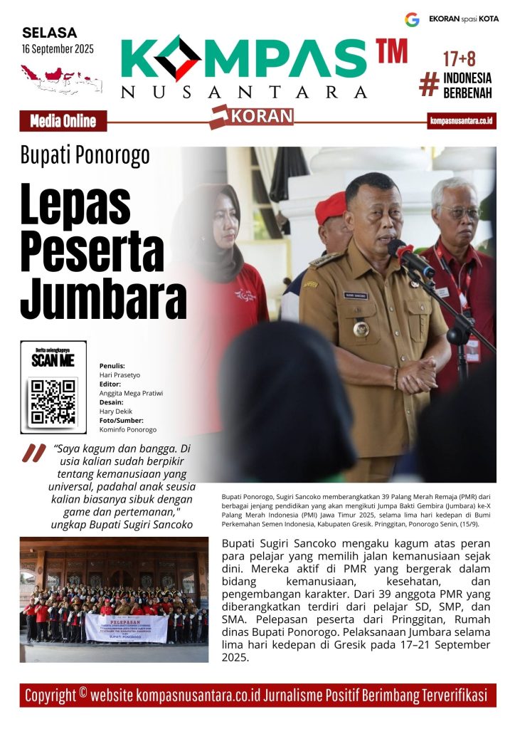 KOMPAS™, PONOROGO – Bupati Sugiri Sancoko melepas 39 anggota Palang Merah Remaja (PMR) dari berbagai jenjang pendidikan yang akan mengikuti Jumpa Bakti Gembira (Jumbara) ke-X Palang Merah Indonesia (PMI) Jawa Timur 2025, selama lima hari kedepan di Bumi Perkemahan Semen Indonesia, Kabupaten Gresik.