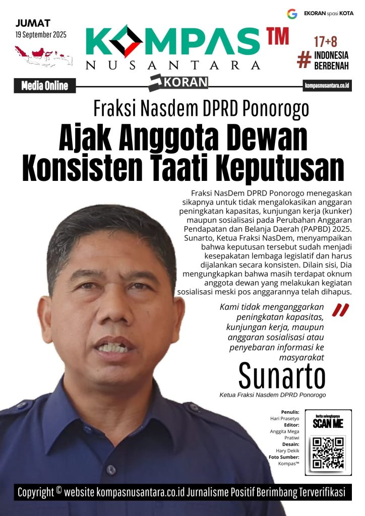 KOMPAS™, PONOROGO – Fraksi NasDem DPRD Ponorogo menegaskan sikapnya untuk tidak mengalokasikan anggaran peningkatan kapasitas, kunjungan kerja (kunker) maupun sosialisasi pada Perubahan Anggaran Pendapatan dan Belanja Daerah (PAPBD) 2025.