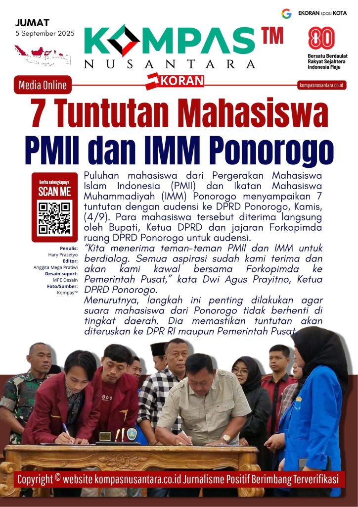 KOMPAS™, PONOROGO – Puluhan mahasiswa dari Pergerakan Mahasiswa Islam Indonesia (PMII) dan Ikatan Mahasiswa Muhammadiyah (IMM) Ponorogo menyampaikan 7 tuntutan dengan audensi ke DPRD Ponorogo, Kamis, (4/9).