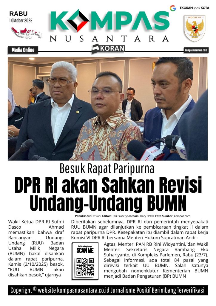 KOMPAS™, INDONESIA – Wakil Ketua DPR RI Sufmi Dasco Ahmad memastikan bahwa draf Rancangan Undang-Undang (RUU) Badan Usaha Milik Negara (BUMN) bakal disahkan dalam rapat paripurna, Kamis (2/10/2025) besok. “RUU BUMN akan disahkan besok,” ujar Dasco saat ditemui di Gedung DPR RI, Rabu (1/10/2025).