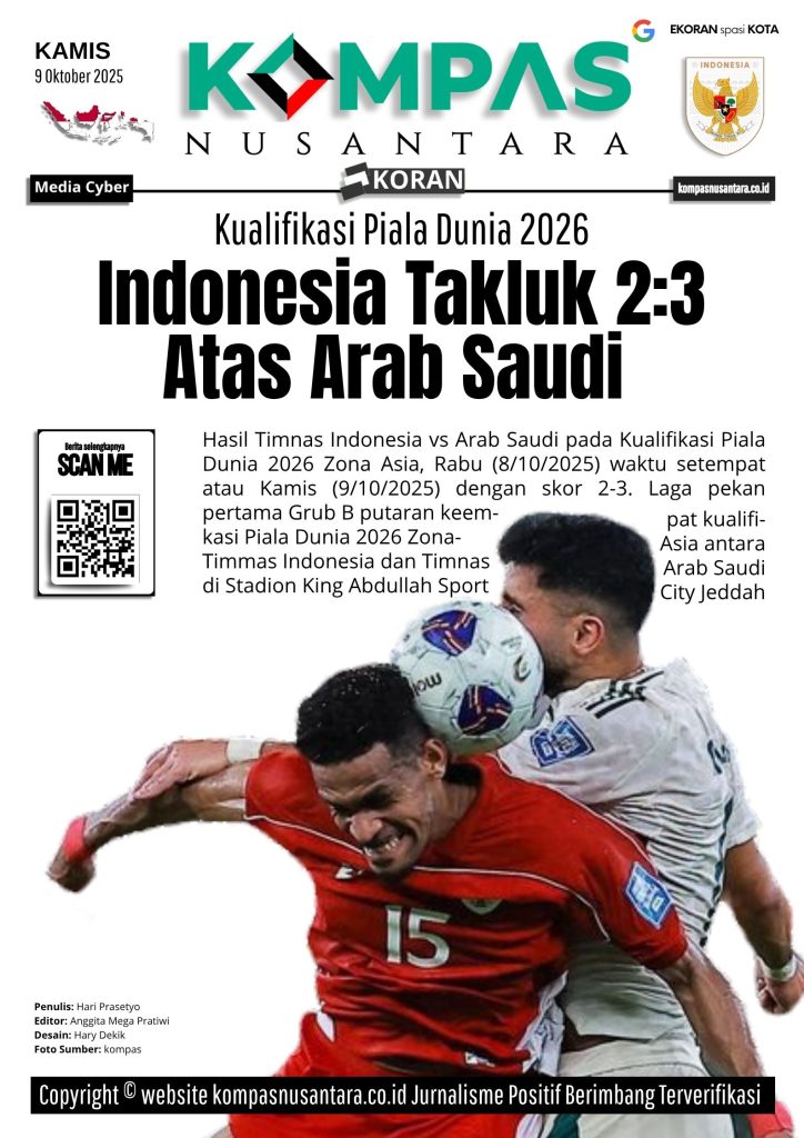 KOMPAS”, INDONESIA – Hasil Timnas Indonesia vs Arab Saudi pada Kualifikasi Piala Dunia 2026 Zona Asia, Rabu (8/10/2025) waktu setempat atau Kamis (9/10) dengan skor 2-3. Laga pekan pertama Grup B putaran keempat Kualifikasi Piala Dunia 2026 Zona Asia antara Timnas Indonesia vs Arab Saudi tersaji di Stadion King Abdullah Sports City, Jeddah.