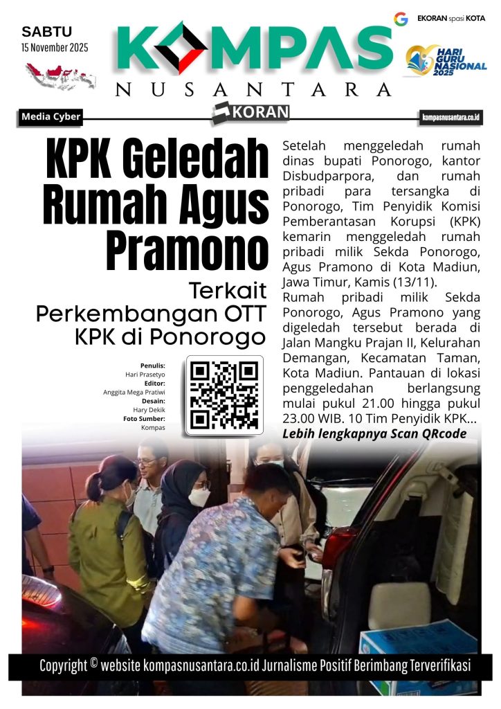 KOMPAS™, PONOROGO – Setelah menggeledah rumah dinas bupati Ponorogo, kantor Disbudparpora, dan rumah pribadi para tersangka di Ponorogo, Tim Penyidik Komisi Pemberantasan Korupsi (KPK) kemarin menggeledah rumah pribadi milik Sekda Ponorogo, Agus Pramono di Kota Madiun, Jawa Timur, Kamis (13/11).