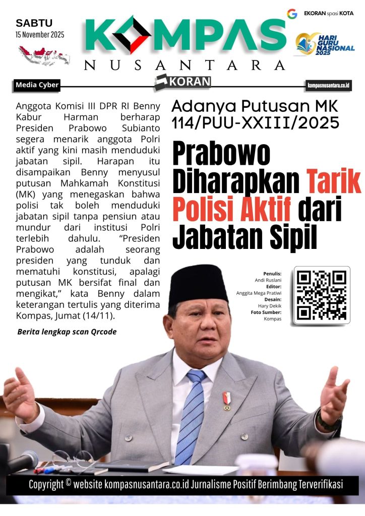 KOMPAS™, INDONESIA – Anggota Komisi III DPR RI Benny Kabur Harman berharap Presiden Prabowo Subianto segera menarik anggota Polri aktif yang kini masih menduduki jabatan sipil. Harapan itu disampaikan Benny menyusul putusan Mahkamah Konstitusi (MK) yang menegaskan bahwa polisi tak boleh menduduki jabatan sipil tanpa pensiun atau mundur dari institusi Polri terlebih dahulu.