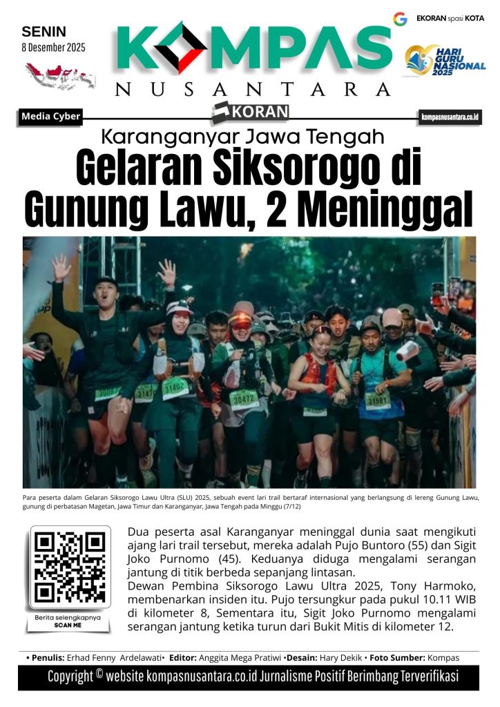 KOMPAS, MAGETAN – Kabar duka mendalam dari Gelaran Siksorogo Lawu Ultra (SLU) 2025, sebuah event lari trail bertaraf internasional yang berlangsung di lereng Gunung Lawu, gunung di perbatasan Magetan, Jawa Timur dan Karanganyar, Jawa Tengah pada Minggu (7/12).