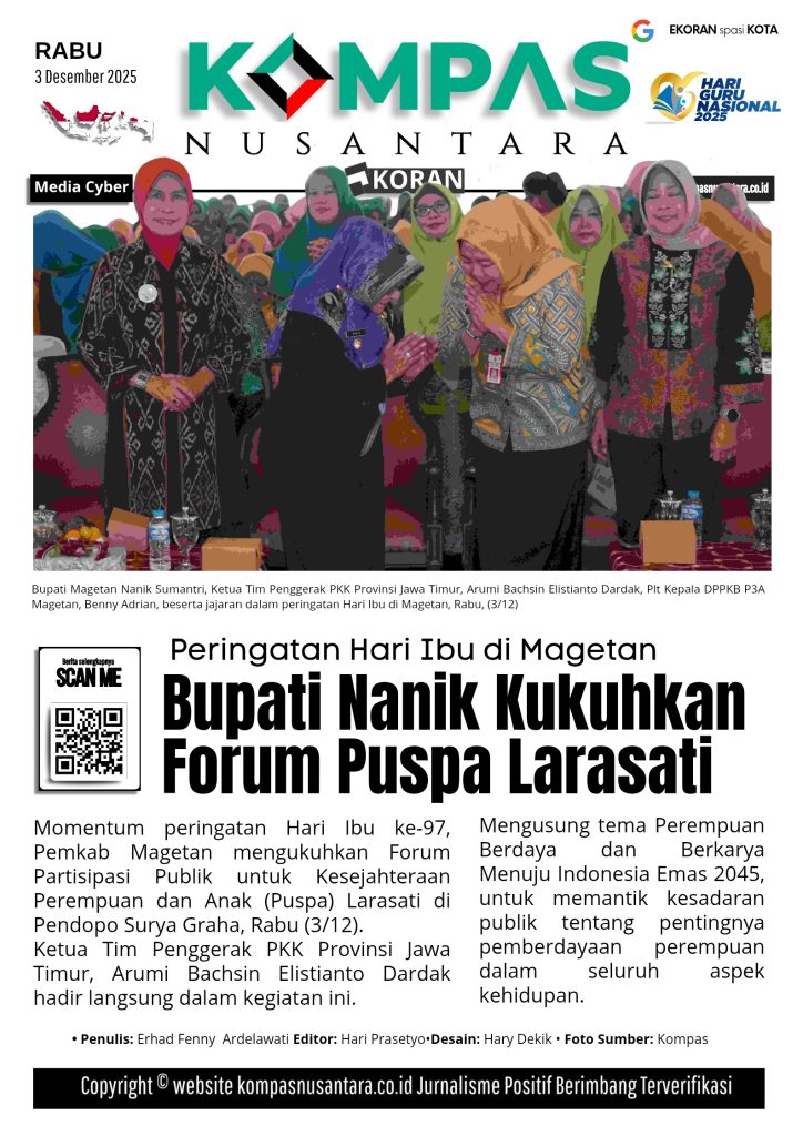 KOMPAS™, MAGETAN – Momentum peringatan Hari Ibu ke-97, Pemkab Magetan mengukuhkan Forum Partisipasi Publik untuk Kesejahteraan Perempuan dan Anak (Puspa) Larasati di Pendopo Surya Graha, Rabu (3/12).