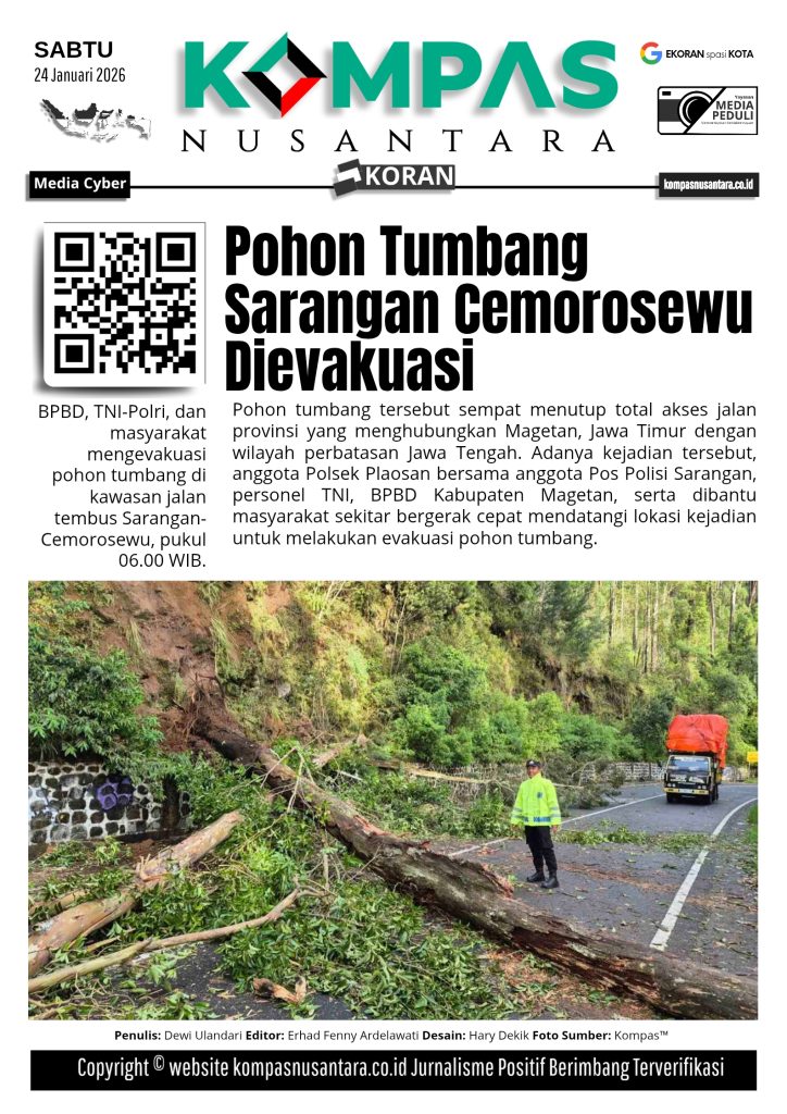 KOMPAS™, MAGETAN – BPBD, TNI-Polri, dan masyarakat mengevakuasi pohon tumbang di kawasan jalan tembus Sarangan-Cemorosewu, tepatnya di wilayah Plaosan, Kabupaten Magetan pada Sabtu, (24/1) sekitar pukul 06.00 WIB.