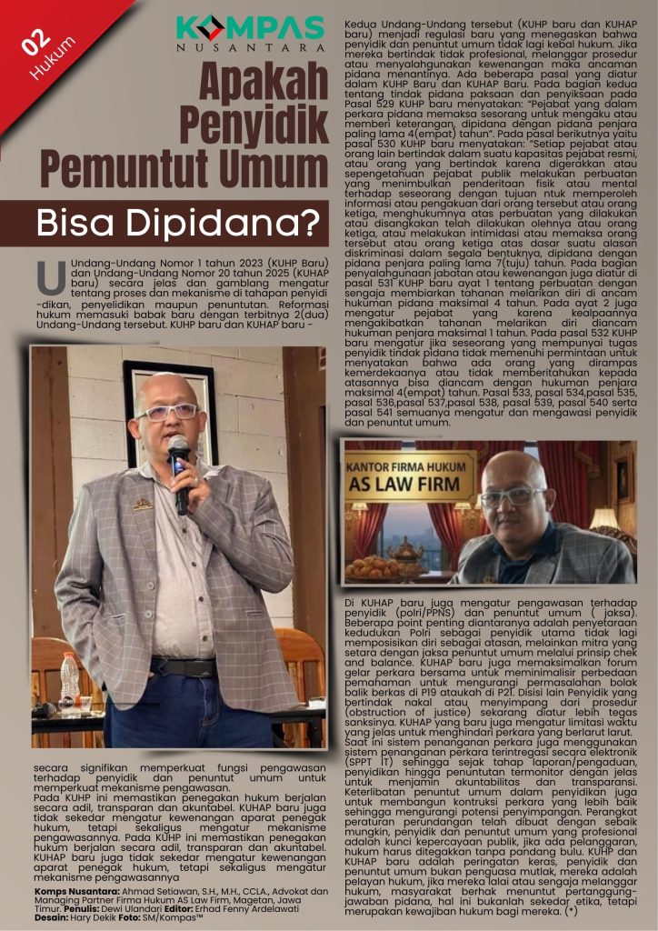 KOMPAS™, MAGETAN – Undang-Undang Nomor 1 tahun 2023 (KUHP Baru) dan Undang-Undang Nomor 20 tahun 2025 (KUHAP baru) secara jelas dan gamblang mengatur tentang proses dan mekanisme di tahapan penyidikan, penyelidikan maupun penuntutan.