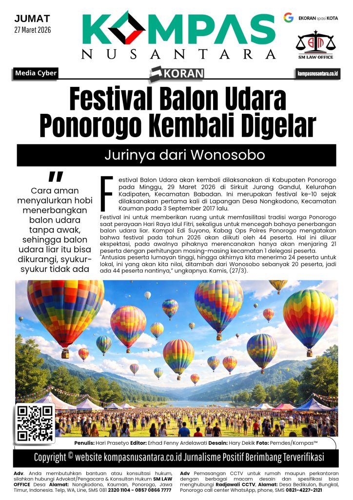 KOMPAS™, PONOROGO – Festival Balon Udara akan kembali dilaksanakan di Kabupaten Ponorogo pada Minggu, 29 Maret 2026 di Sirkuit Jurang Gandul, Kelurahan Kadipaten, Kecamatan Babadan. Ini merupakan festival ke-10 sejak dilaksanakan pertama kali di Lapangan Desa Nongkodono, Kecamatan Kauman pada 3 September 2017 lalu.