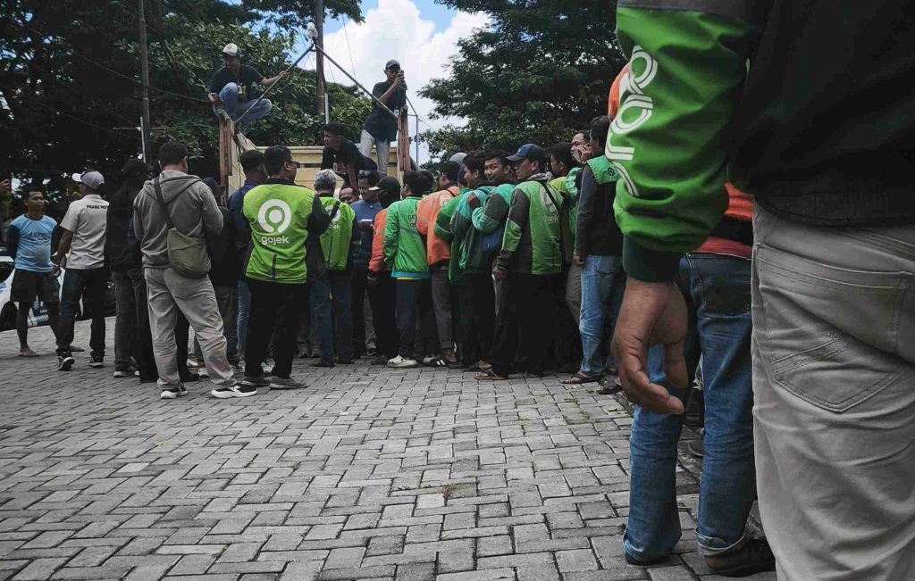Senyum merekah nampak pada ratusan driver ojol dan tukang becak saat prosesi penerimaan bantuan, mereka antri dengan berbaris rapi di halaman parkir Stadion Batoro Katong sebelah selatan.