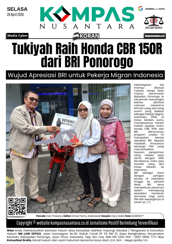 KOMPAS™, PONOROGO – Kebahagiaan tak mampu ditutupi Tukiyah, warga Desa Trisono, Kecamatan Babadan, Ponorogo. Ia tak pernah menyangka bahwa aktivitas rutinnya menerima kiriman uang dari sang suami yang bekerja sebagai Pekerja Migran Indonesia (PMI) di Korea Selatan, justru membawanya meraih hadiah sepeda motor Honda CBR 150R dari BRI.