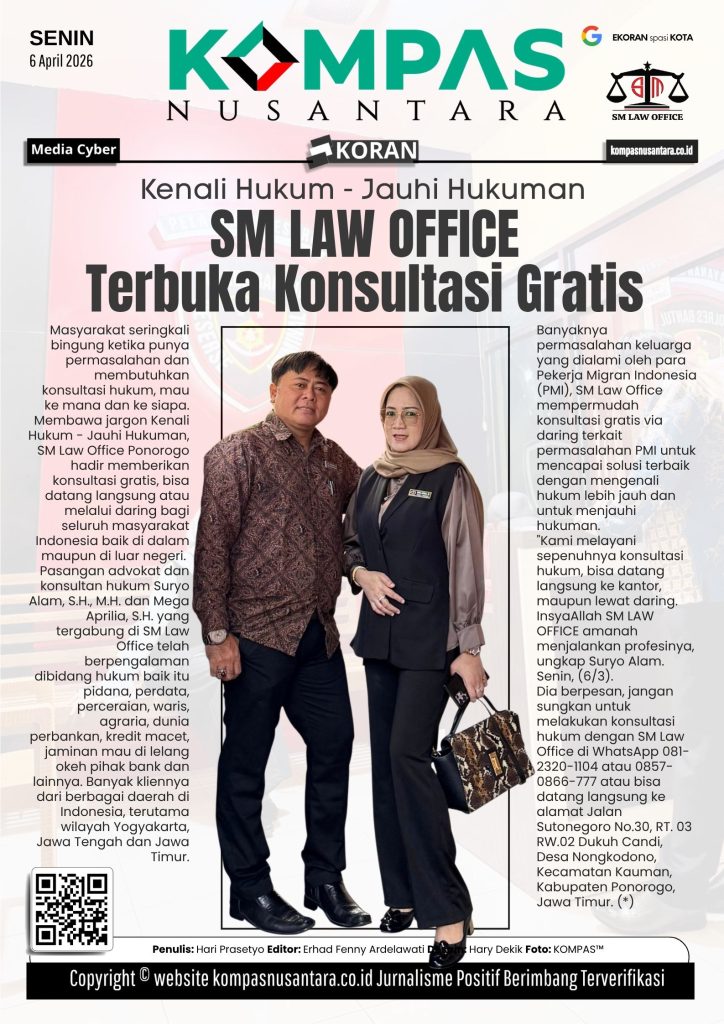 KOMPAS™, PONOROGO – Masyarakat seringkali bingung ketika punya permasalahan dan membutuhkan konsultasi hukum, mau ke mana dan ke siapa. Membawa jargon Kenali Hukum – Jauhi Hukuman, SM Law Office Ponorogo hadir memberikan konsultasi gratis, bisa datang langsung atau melalui daring bagi seluruh masyarakat Indonesia baik di dalam maupun di luar negeri.